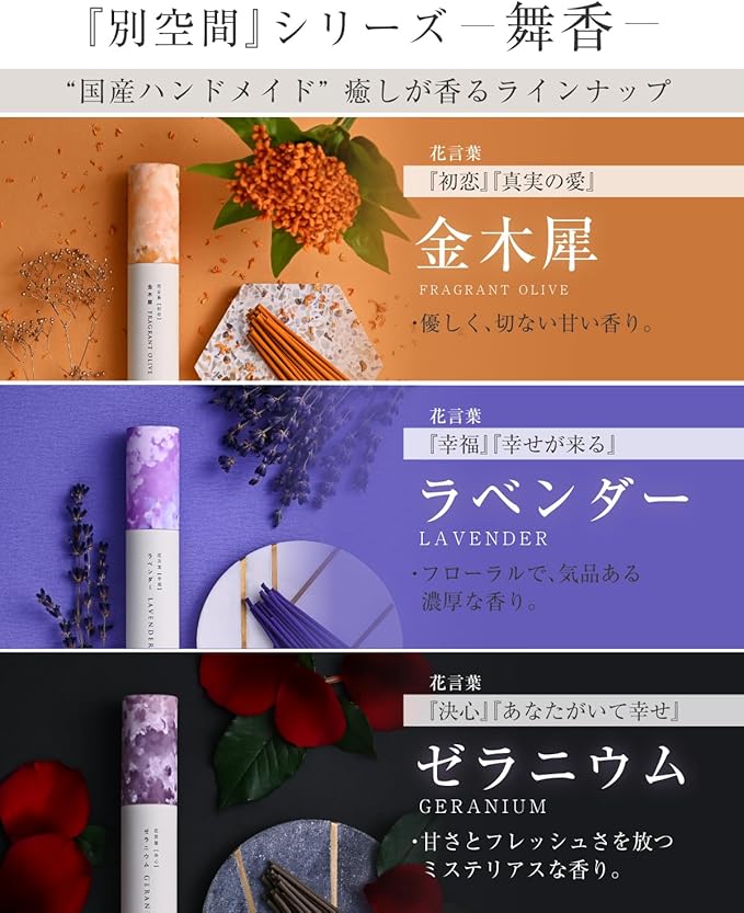 香り ゼラニウム 甘くミステリアスでセクシーな香り, ラベンダー 芳醇で気品ある濃厚な香り, 金木犀 甘く、優しい切ない香り