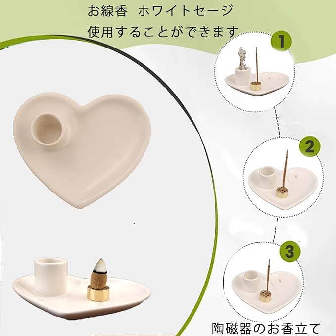 【製品情報】ハート型がかわいいです。お香立てでなくても、小物置きとしても使えます。 シンプルですが香立て部分が分けられているので、灰が落ちても手入れしやすいです。質感もよいです『枝付きセージは付属しません』。