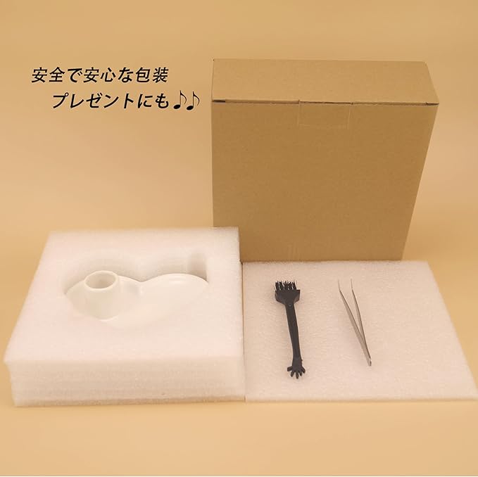 【良いデザイン】落ち着いた白の陶製で、適度な厚みもあり安定感があります,このデザインなら違和感なく使えます。付属のハケでササッと綺麗な状態に出来るので便利だなぁと思いました。パロサントを置くのに丁度よく、灰が外に溢れる心配も無くて良かったです。デザインも可愛くてとても気に入ります。
