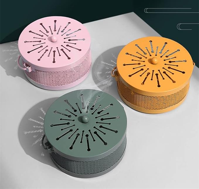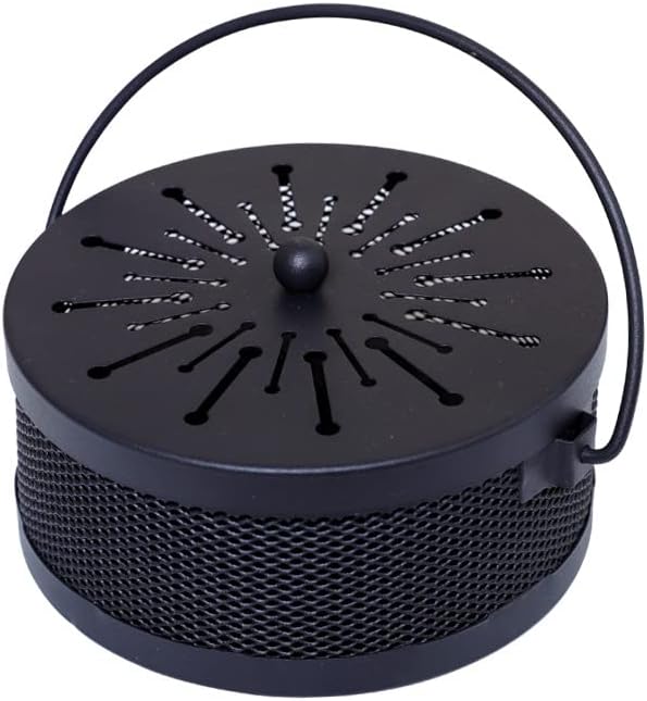 鉄製でどっしりした重さがあり、蓋と取っ手付きのオシャレな蚊取り線香ホルダー。穴より風通しがよく、可愛らしい丸い取っ手の蓋と3点の足も付いていますので安全性があります。