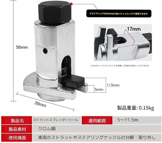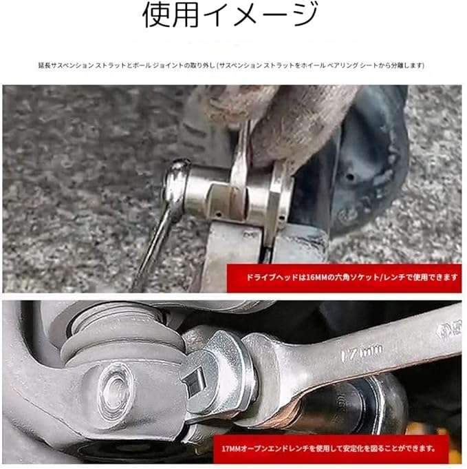 【使用方法】この商品を使用する際は、別途16mmおよび17mmのスパナとソケットレンチが必要になります。これらのツールを用意することで、作業を円滑に進めることができます。