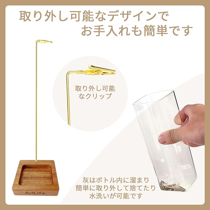 ✓線香本体がガラス容器内に収まる設計で、高さのある透明ガラスカップが灰をしっかりと受け止め、香の灰が自然と底に溜まっていきます。家具や床を汚さず、風で舞う心配もありません。お掃除の手間を減らし、清潔な空間を保てます。さらに、お香に手や周囲の物が直接触れない構造で、安全にお使いいただけます。香炉本体は軽量かつコンパクトな設計で、どこにでもすっきりと収まります。