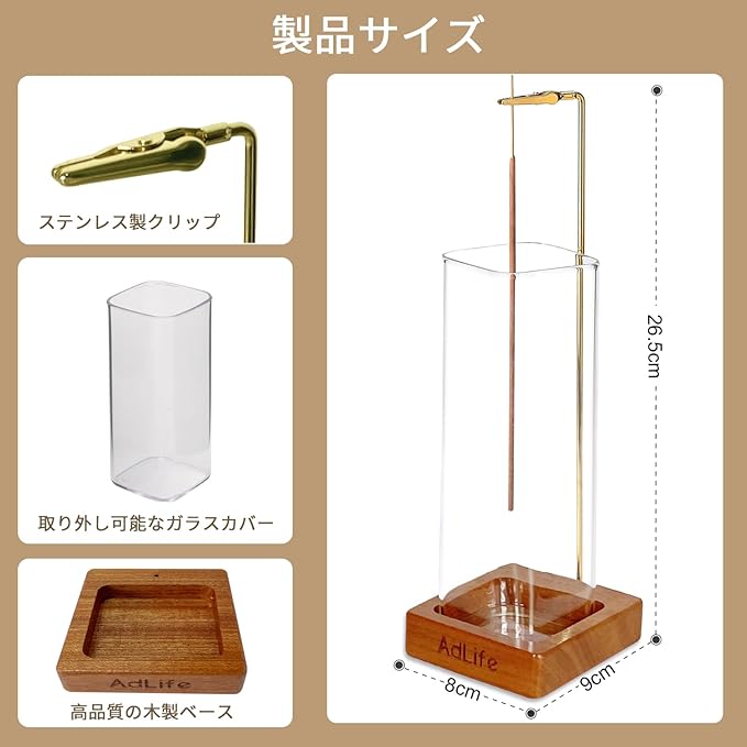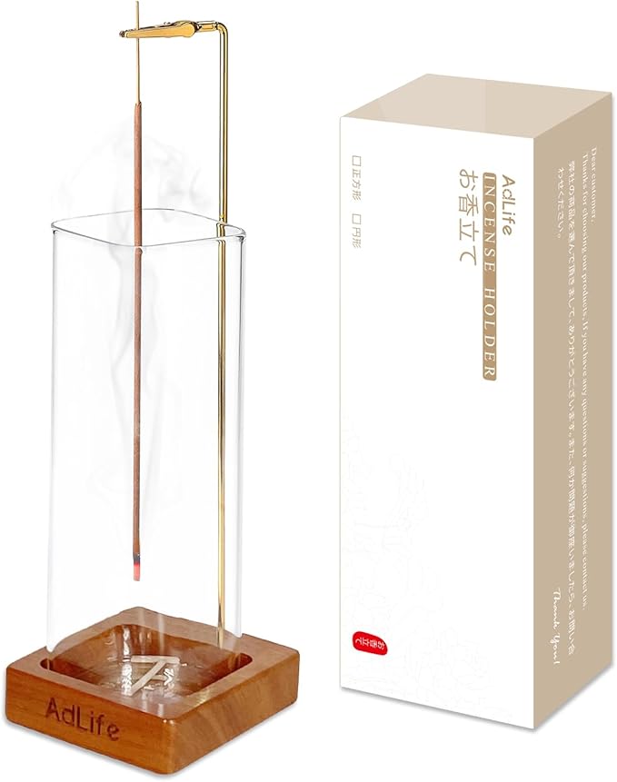 AdLife お香立て 灰がこぼれない 吊り下げ式 線香立て 香炉 ガラス 真鍮 木製台座 おしゃれ 可愛い インテリア 香道 仏壇 寝室 書斎 玄関 ヨガ 瞑想 贈り物に (方形) | KAZESHOP