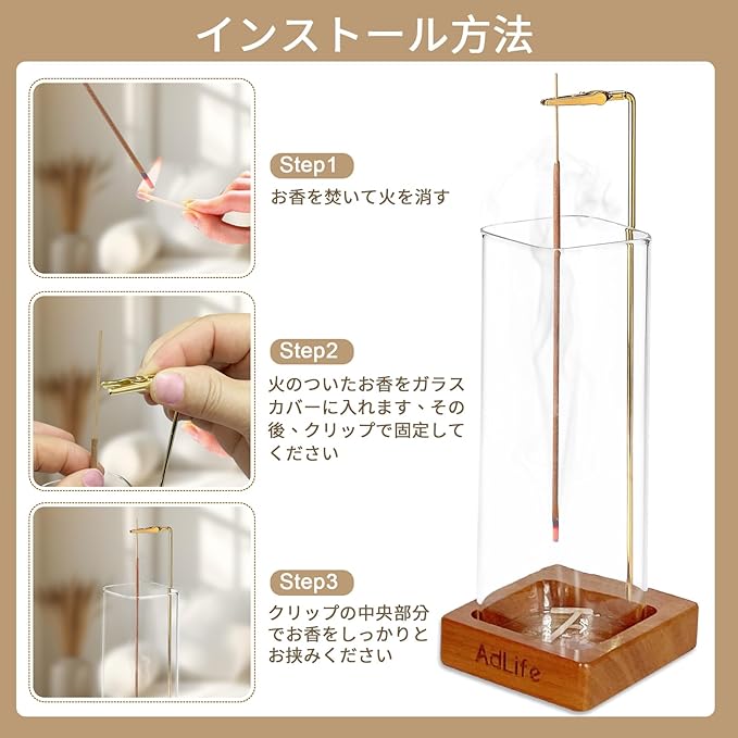 ✓【御洒落なお香立て】透明なガラスお香皿 + 真鍮クリップ + 木製けやき台座の組み合わせが、和室にも洋室にもマッチ。リビング、寝室、玄関など、どこにでも合わせやすいデザインに仕上げています。上質な素材感が空間を引き立て、インテリアとしても魅力的です。自宅、旅館、仏堂、茶室、居酒屋、図書館、瞑想室、御手洗い、ティーハウス、オフィス、リビングルーム、ヨガなど、空気を浄化したい、やさしい香りを楽しみたい空間に最適です。