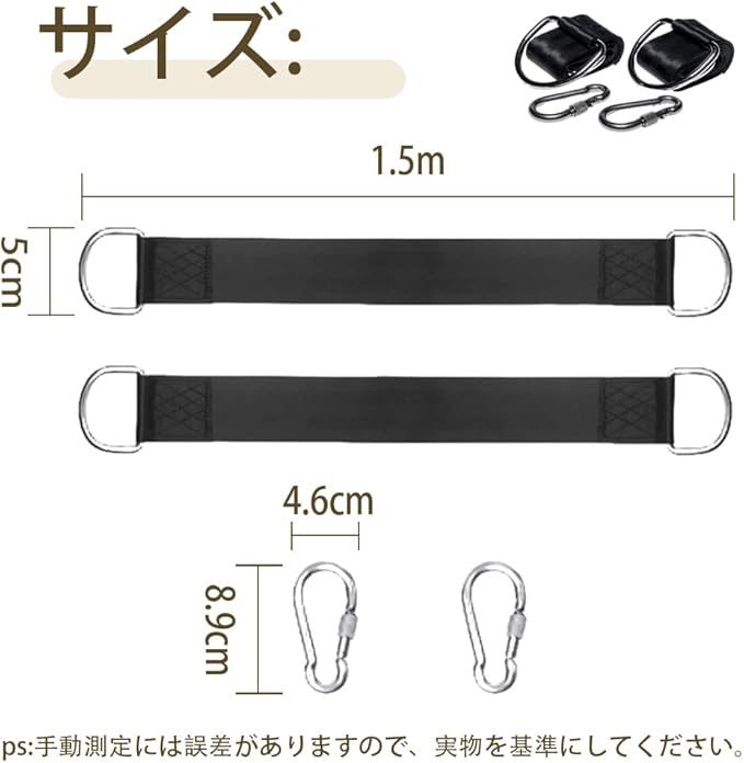 【適用範囲】ブランコ 、 吊り輪 、 ハンモック 、 エアリアル ヨガ 、 サンドバッグ などの吊り下げ式遊具に幅広くご利用いただけます。また、 固定用ベルト としてだけではなく、自動車用 の 牽引縄 や 引っ越し 時の 荷物 引き縄 としても 使用 していただけます。室内や庭、キャンプ、アウトドアなどいろんな場所で使えます。