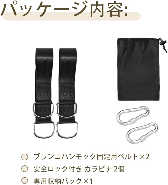 【セット内容】ブランコハンモック固定用ベルト 2、安全ロック付き カラビナ 2個、専用収納バック 1
