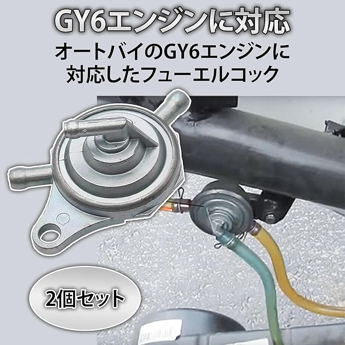 GY6エンジンに対応したフューエルコック:オートバイのGY6エンジンに対応したフューエルコックです。こちらのフューエルコックは50cc、125cc、150ccのGY6エンジンにそれぞれ対応しています。