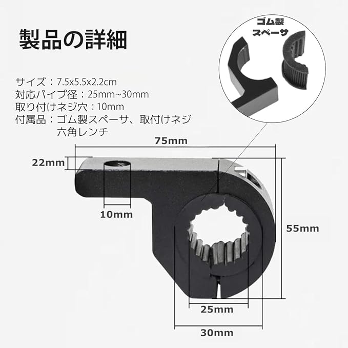 【サイズ】本体:75mm 50mm 23mm、穴サイズ:10mm、適応パイプ:約22mm-30mm対応可能