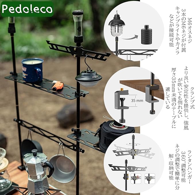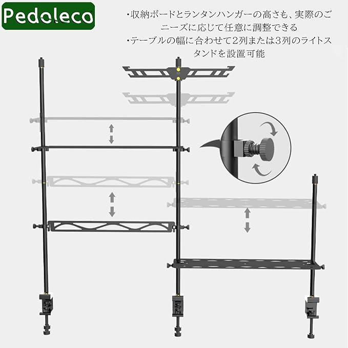 Pedoleco キャンプ用ランタンスタンド 卓上 アルミ製 折り畳める 収納袋付き 高さ調整可能 キャンプ/ビーチ/釣り/登山/遠足 クランプ式 吊り下げ 軽量 組み立て簡単 持ち運び便利 用品整理 アウトドア | KAZESHOP
