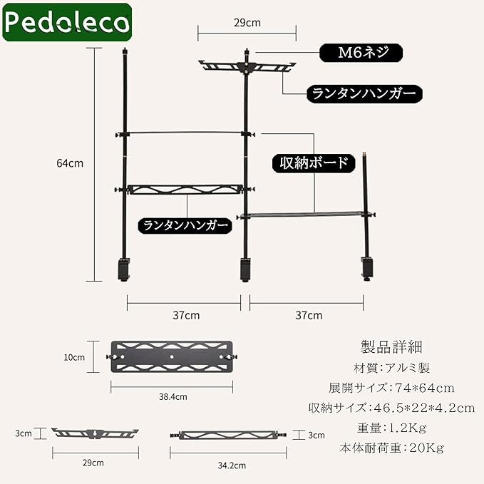 「商品特徴」材質:アルミ製、展開サイズ:74*64cm、収納サイズ:46.5*22*4.2cm、重量:1.2Kg、本体耐荷重:20Kg、製品リスト:ポール*5、クランプ*3、ランタンハンガー*2、収納ボード*2、M6ネジ*3、収納袋*1。