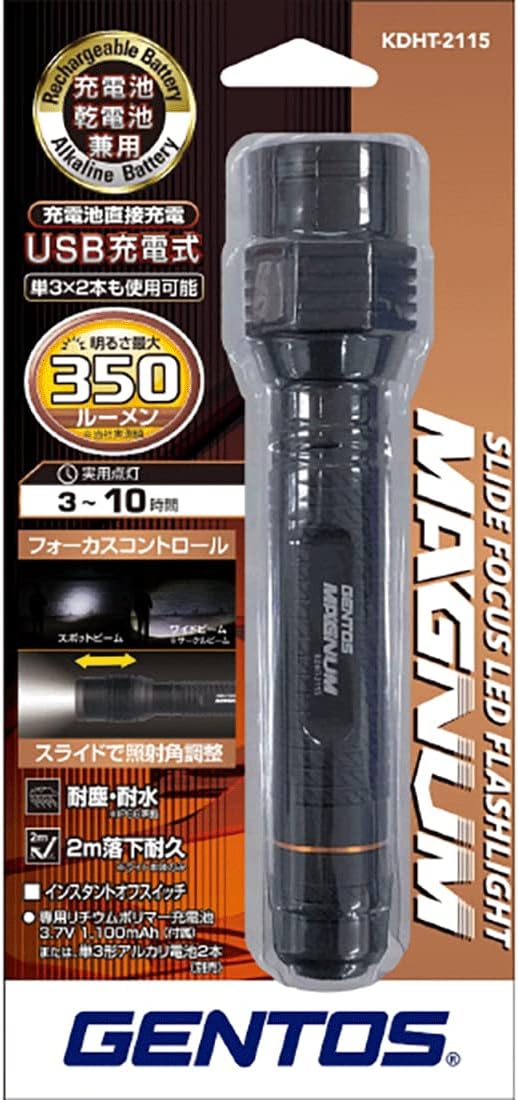 ●使用光源:高輝度チップタイプ白色LED 1個 ●明るさ(約):350ルーメン(Highモード時)/160ルーメン(Midモード時)/55ルーメン(Ecoモード時) ●輝度(約):5945カンデラ(Highモード時)/2751カンデラ(Midモード時)/875カンデラ(Ecoモード時) ●使用電池:専用リチウムポリマー充電池 3.7V 1,100mAh または 単3形アルカリ電池 2本 ●充電時間(約):4時間 ●電池寿命:充放電 約300回 ●点灯時間(約):3時間(Highモード)/5時間(Midモード)/10時間(Ecoモード) ●照射特性:フォーカスコントロール ●照射距離(約):154m(最大時) ●保護等級:耐塵・耐水仕様(IP66準拠) ●落下耐久:2m落下耐久 ●寸法(約):φ3.23 16.04cm ●質量(約):150g(電池含む) ●付属品:ストラップ、Micro USBケーブル(50cm)、専用充電池
