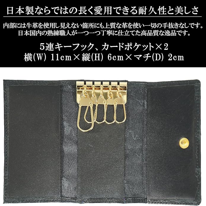 【日本の熟練職人が丹精込めて仕立てた高級キーケース】 数あるエキゾチックレザーの中で絶大な人気を誇る、「皮革の宝石」クロコダイル革を惜しみなく使用。 圧倒的な存在感で周囲の人からの評価が上がり、あなた自身の装いをより魅力的にしてくれます。 本体はシックで落ち着いたブラックのクロコダイル革、金具には華やかなゴールドの5連キーフックを採用し、 洗練された大人のためのラグジュアリーなデザインに仕上げました。