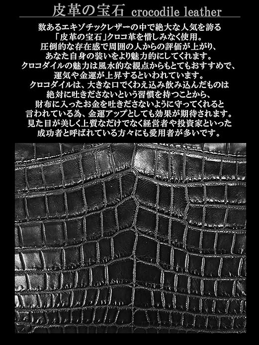 【風水の観点 金運財運&人脈上昇】 ワニ革は風水において、財運や成功を象徴する特別な素材とされています。 古来より、ワニは力強さと繁栄の象徴とされ、持つことで富を引き寄せ、安定した金運を築くと信じられています。 クロコダイルは、大きな口で獲物をくわえ込むと決して離さない習性を持ち、その特性が「一度手にした財を逃がさず守る」という意味につながっています。 実際に、経営者や投資家など成功を収めた人々に愛用者が多いです。 強靭で長く愛用できるため、風水では「途切れることのない繁栄」を象徴するとされています。 丈夫なものは長く使えるだけでなく、持ち主の運気も安定させる力を持つとされ、特にビジネスや投資など長期的な成功を望む人にとって理想的なアイテムといえます。