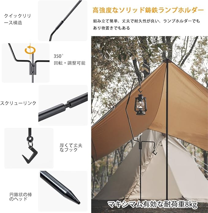 【高品質】高品質のスチールを採用し、しっかりした作りで程よい重量感を持っています。ランタンスタンドの全体は太さ9mmの鉄棒で余分な隙間がなく、揺れもなく、耐久性・耐荷重を向上させます。