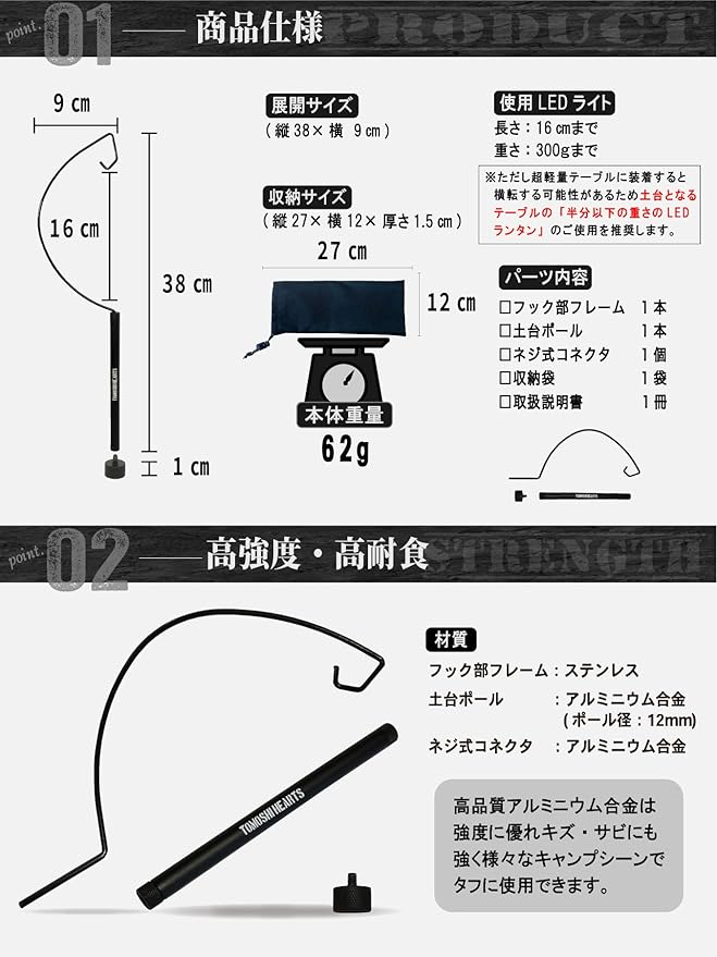◆【商品詳細】展開時:高さ38 幅9㎝ 収納時:27 12㎝ 1.5㎝ 本体重量:62g 【材質】ネジ式コネクタ:アルミ合金 土台ポール:アルミ合金 フック部フレーム:ステンレス 【耐荷重】300gまで ※ただし超軽量テーブルに装着する場合横転する可能性があるため土台となるテーブルの「半分以下の重さのLEDランタン」のご使用を推奨します。【ポール径】12mm(ポール壁の厚さ1.5mm)