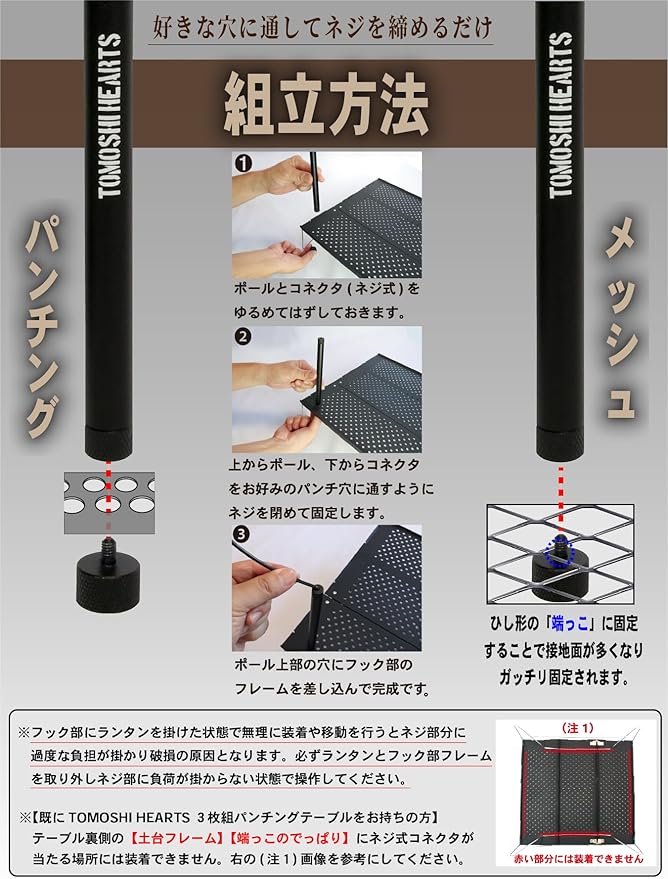 【注1】テーブル天板の突起物などに土台ポールまたはネジ式コネクタが接触する場所はネジを絞め込めないため固定できません。【注2】フック部にランタンを掛けた状態で無理に装着や移動を行うとネジ部分に過度な負担が掛かり破損の原因となります。必ずランタンとフック部フレームを取り外しネジ部に負荷が掛からない状態で操作してください。【注3】ネジを強く締めすぎるとネジ部の破損またはテーブルが破損する恐れがあるため強く締めすぎないでください。【注4】LEDランタン専用です。オイルランタンやキャンドルランタンは危険なため使用しないでください。【注5】商品画像の「LEDランタンやランタンシェード」は付属していません。ランタンスタンドのみの販売です。