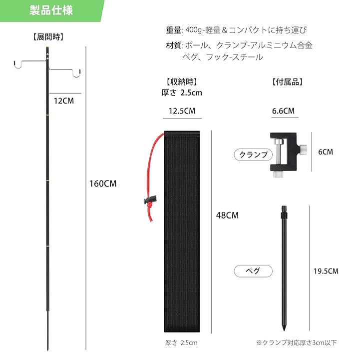 【製品仕様】:ランタンポール材質:高強度アルミ製、ペグ:スチール。商品の総重量は400gです。組み立て時長さ:約57~160cm、収納時サイズ:36*7*4.5cm、耐重量2kg。梱包内容:ランタンスタンドポールx3、ランタン吊るすフックx1、クランプx1、ペグx1、収納袋x1。