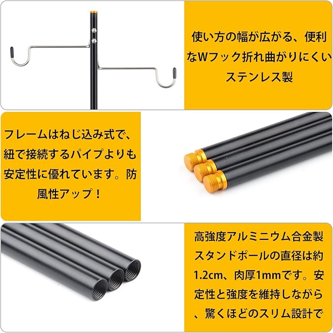 【組立簡単】:組み立てはネジで連結してペグやクランプで脚部を固定するだけ。専門工具無しで数分で設置可能です。クランプ固定具を使用すれば、テーブルやラックに挟んで固定するだけです。 ※ペグはポール内部に挿入されています。 ※組み立て前に、ポール内部のペグを必ず取り出してから組立ててください