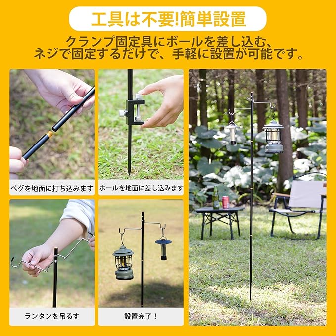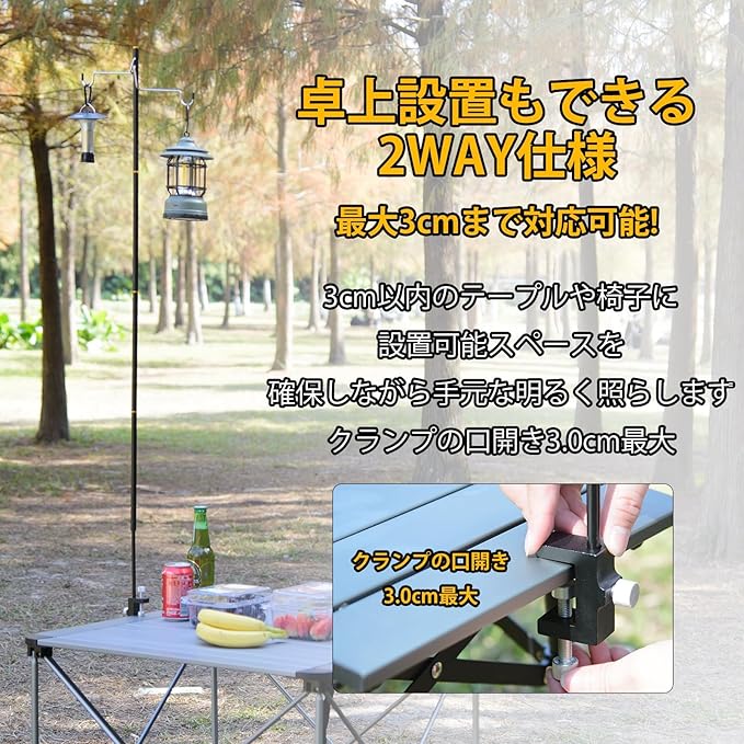 【クランプ・ペグの2WAY設置スタイル】:このランタンスタンドは地面に刺すだけでなく、卓上設置でもできる2WAY仕様なので、状況に応じて自由に使い分けることができ、テーブルに挟めば家にいながらキャンプ気分も味わえます。キャンプサイトの自由な場所に打ち込んで設営できます。スペースも取らず、ランタンを吊して上から明るく照らせて便利です。