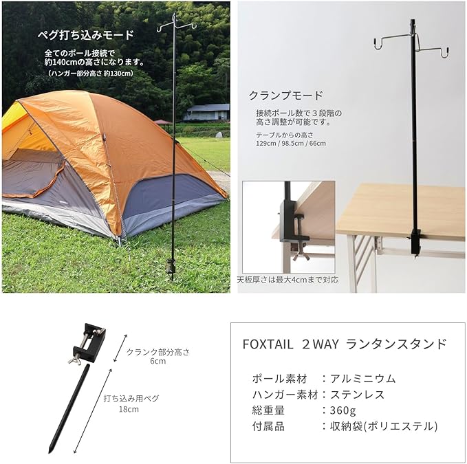 【打ち込み式&テーブル固定式の2WAY仕様】ペグによる打ち込み式&テーブルに固定するクランプ式。キャンプのスタイル、環境に合わせてご使用いただけます。