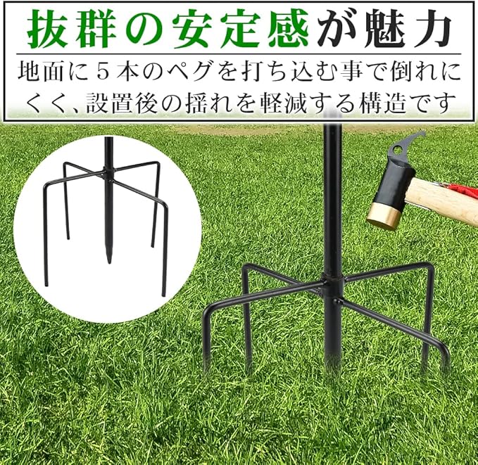 ペグの先端は剣先タイプになっているため、硬い地面でもしっかりと挿し込むことができます。ハンマーで少しずつ叩くようにして設置してください。
