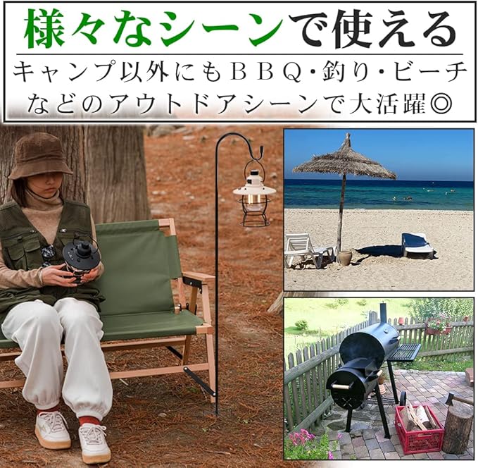 全体を明るく照らすことができる組み立て式のランプ取り付け用ポールです。地面にしっかり食い込む長針設計のペグを5カ所に打ち込むことで、安定感が生まれ風の影響を受けにくい仕様です。