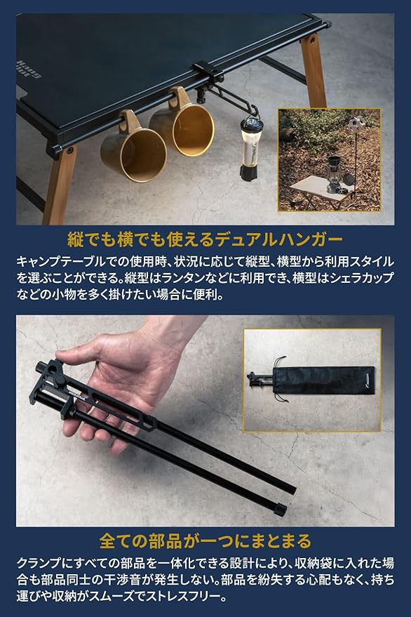 縦でも横でも使えるデュアルハンガー。 キャンプテーブルでの使用時、状況に応じて縦型、横型から利用スタイルを選ぶことができる。縦型はランタンなどに利用でき、横型はシェラカップなどの小物を多く掛けたい場合に便利。