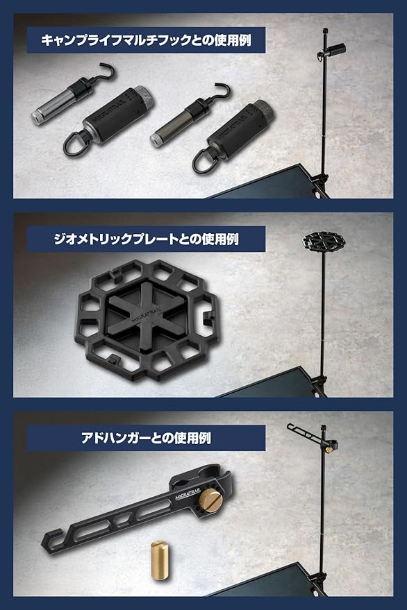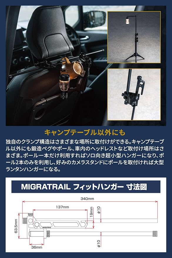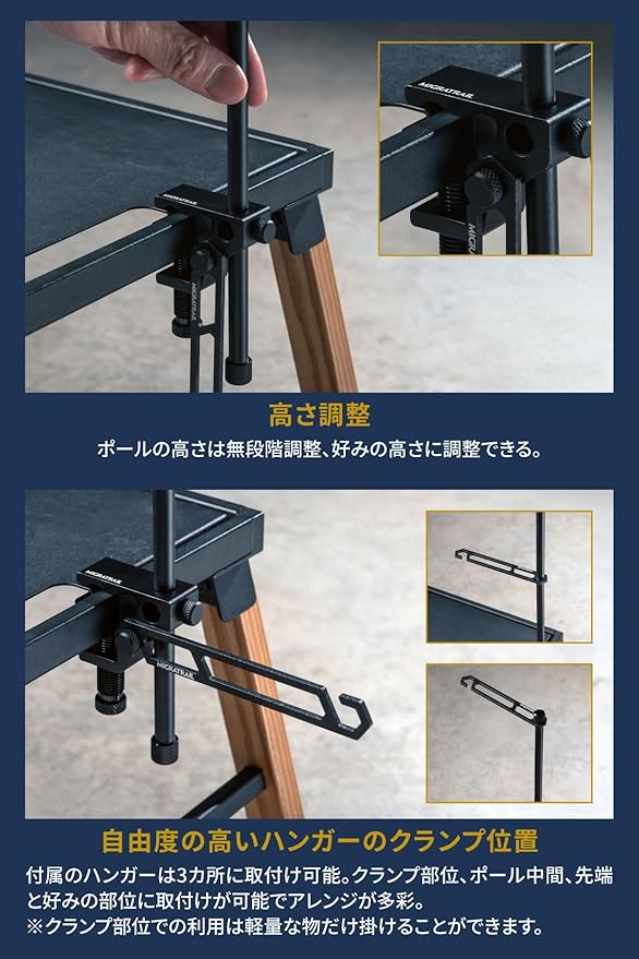 付属のハンガーは3カ所に取付け可能。クランプ部位、ポール中間、先端と好みの部位に取付けが可能でアレンジが多彩。