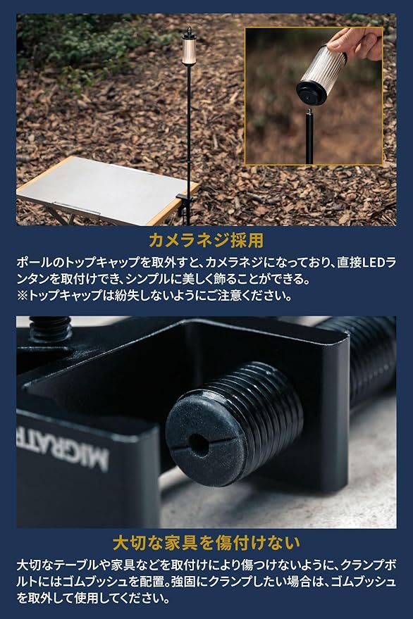 ポールのトップキャップを取外すと、カメラネジになっており、直接LEDランタンを取付けでき、シンプルに美しく飾ることができる。