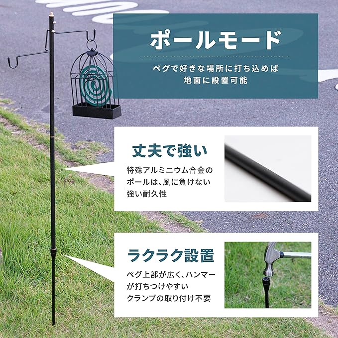 【打ち込み式】ペグ上部を広く設計しておりそのままハンマーで打ち込めます。設置時もクランプの取付不要だから楽チン。一本脚タイプは設置面積も最小限で済むのでスペースを取りません。高さ:34~129㎝。