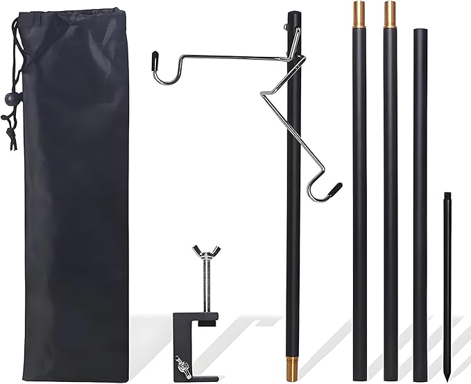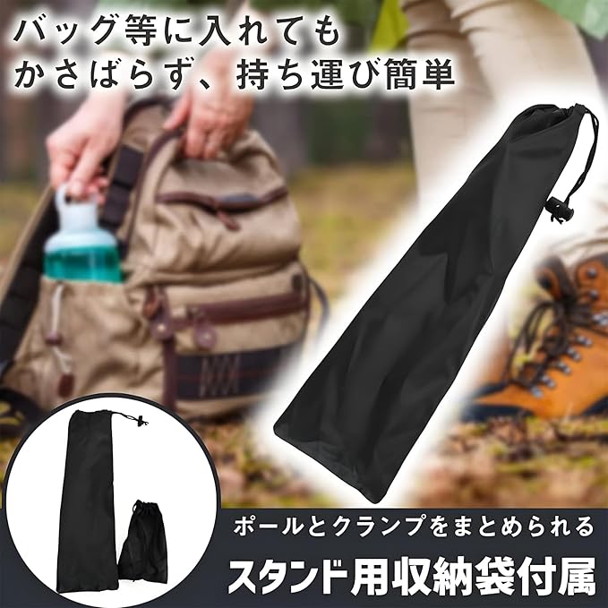 【折りたたみ式・持ち運びが簡単】折りたたみ式の設計で、収納袋が付属しているため、持ち運びが非常に簡単です。ポールやクランプなどをまとめて収納でき、キャンプやアウトドア活動の際に邪魔になりません。セット内容はランタンポール 4、フック 2(装着済)、クランプベース 1、ペグ 1、収納袋 1で、必要なものがすべて揃っています。