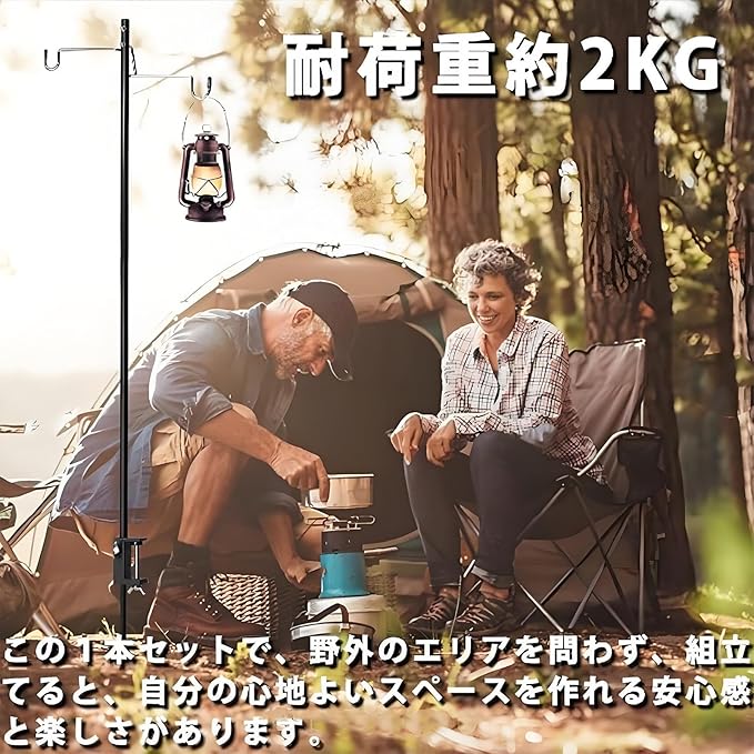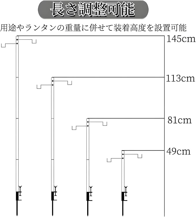 【高強度素材・調整可能な高さ】高強度のアルミ素材を使用しており、直径11mm、重さ約370g(付属品含む)で、軽量でありながら強度があります。高さは約49~145cmと調整可能で、用途やランタンの重量に応じて装着高さを設定することができます。耐荷重は約2kg(2個 1kg)で、安定して使用できます。