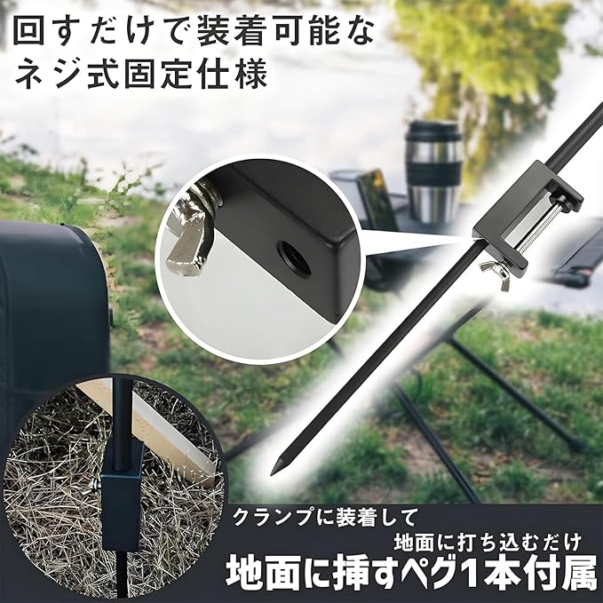 【2Way設営・簡単な組み立て】2Wayの設営方法を採用しており、クランプ式と地面に打ち込む式の2種類が選べます。クランプ式は厚さ4.5cm以内のテーブルやラックに挟んで、クランプスタンド底部のネジを回して固定するだけ。打ち込む式はクランプのペグ固定用口にペグを差し込み、地面に打ち込むことで設営できます。本体の組み立ても、ポールにネジ口があり、口の位置を合わせて回してネジを締めるだけで簡単に組み立てられます。