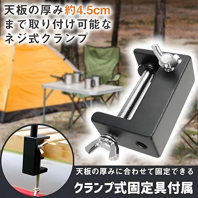 【ネジ式固定・便利な取り付け】ランタンハンガーやクランプ、ペグなどの取り付けにはネジ式の固定仕様を採用しており、回すだけで簡単に装着できます。工具を必要とせず、誰でも手軽にセットアップできます。また、天板の厚みに合わせて固定できるクランプ式固定具が付属しており、使い勝手が抜群です。