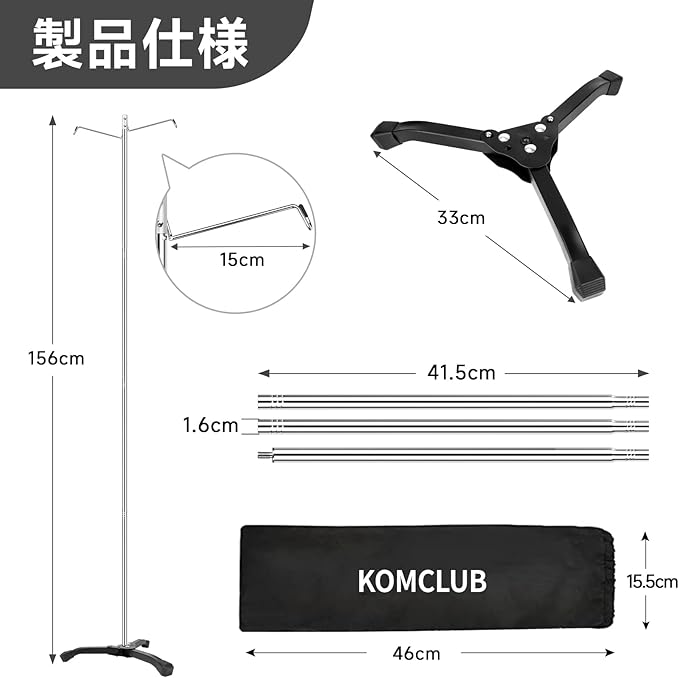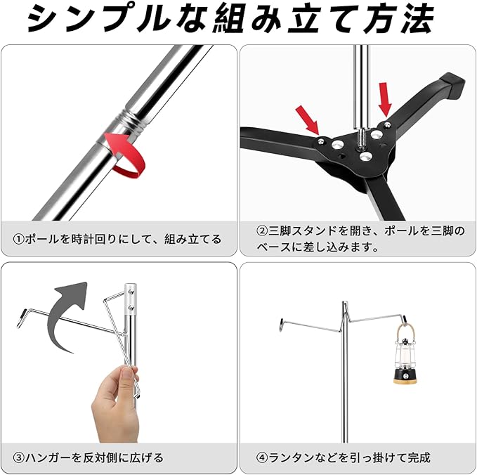 【高さ調節可能&ダブルフック設計】ポールは3段階(約81cm・119cm・156cm)で高さ調整が可能。付属のフックは2つ付きで、ランタンの吊り下げはもちろん、調理器具の乾燥、ケトルや小型スピーカーなど(※1.5kg以下)の収納にも大活躍。アウトドアはもちろん、室内での日用品整理にも便利です。
