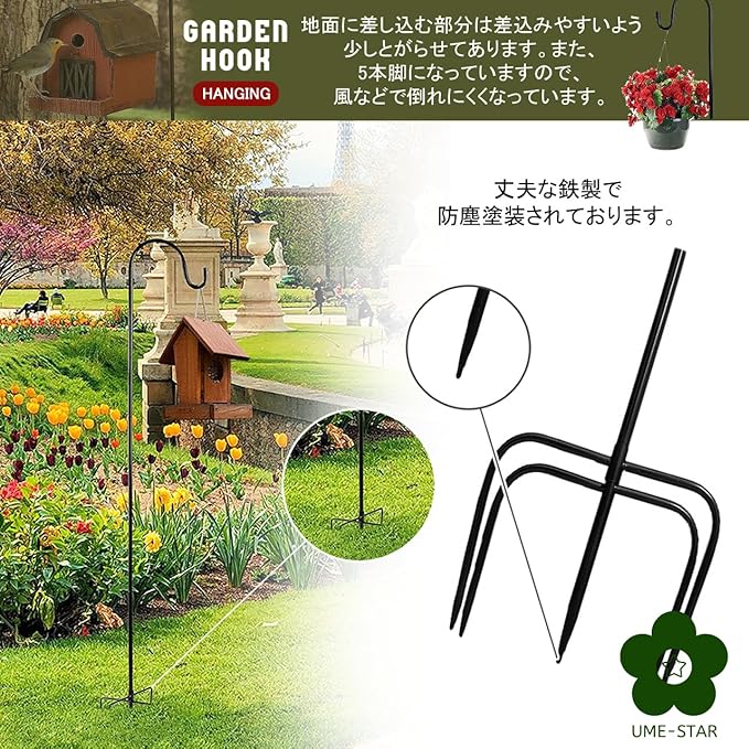 地面に差し込む部分は差込みやすいよう少しとがらせてあります。また、5本脚になっていますので、風などで倒れにくくなっています。 丈夫な鉄製で防塵塗装されております。