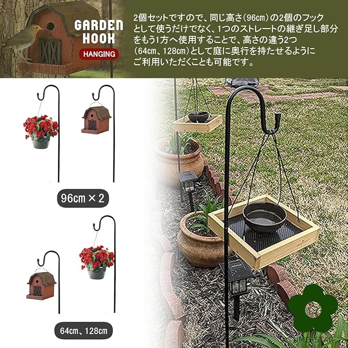 2個セットですので、同じ高さ(96㎝)の2個のフックとして使うだけでなく、1つのストレートの継ぎ足し部分をもう1方へ使用することで、 高さの違う2つ(64㎝、128㎝)として庭に奥行を持たせるようにご利用いただくことも可能です。