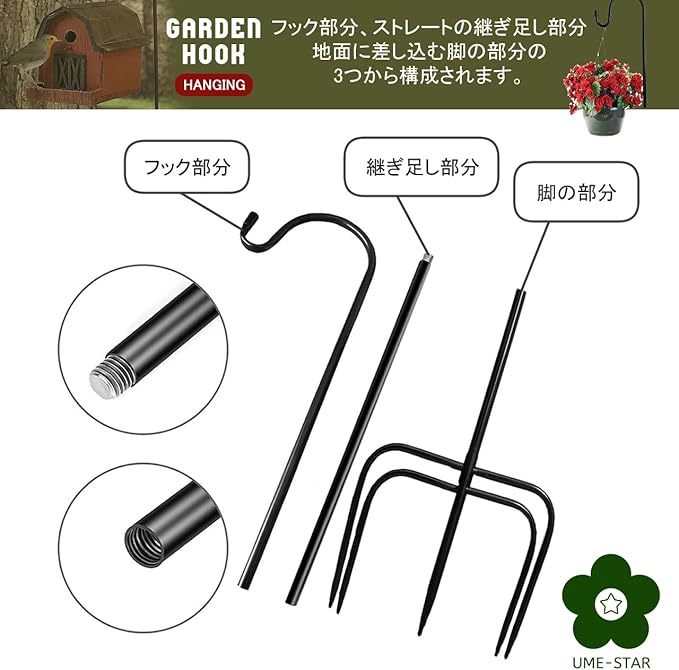フック部分、ストレートの継ぎ足し部分、地面に差し込む脚の部分の3つから構成されます。