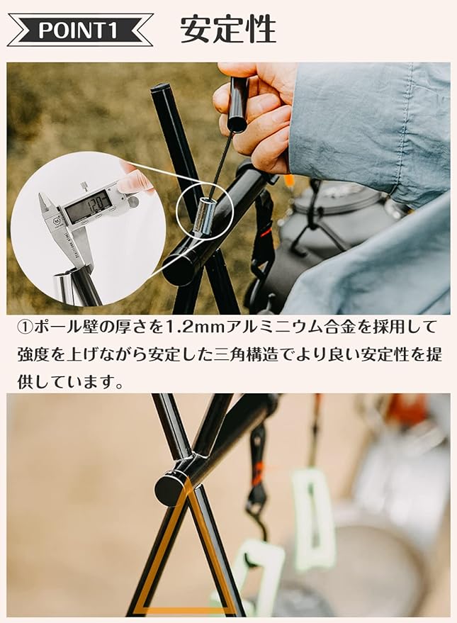 【高強度素材・安定性アップ】本体のポール壁の厚さを1.2mmアルミニウム合金を採用して、強度を上げながら安定した三角構造でより良い安定性を提供しています。ハンギングラックの長さと幅のサイズを改良することにより、多くの物を吊るすことができる上に、三角構造の角度も変わってきて、最も安定な構造になります。