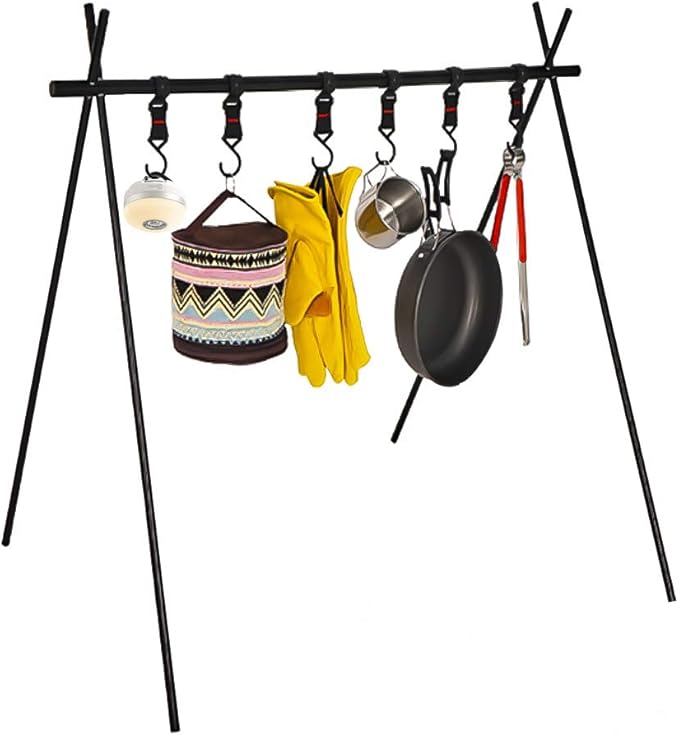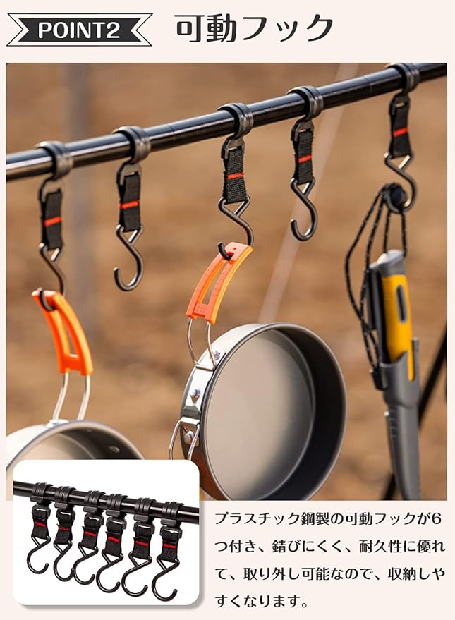 【様々な機能性付き】プラスチック製のフックが6つ付いておりますので、アウトドアの際に食器・小物や提灯の吊り下げなどに最適で、シュラフ・衣類なども掛けられます。洗濯物干し用のラックとして、室内や庭でもご利用いただけます。様々な機能性付き、ハンギングラックだけでなく、ハンガーラックやランタンスタンドも呼ばれています。