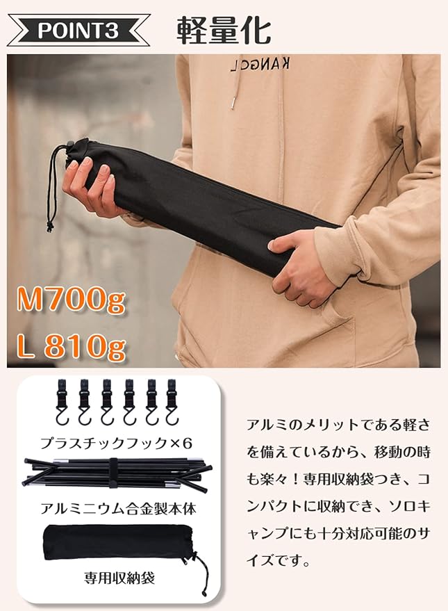 【持ち運びに便利】軽量化のアルミニウム合金材質を使用して、錆びにくく、軽くて頑丈です。重量が810gで、収納サイズは約45 10 6cm、コンパクトに折り畳んで専用の収納袋に保管でき、荷物にならず持運びが楽チン!