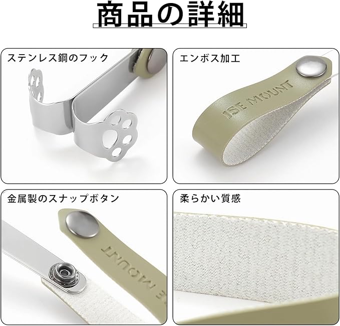 【高品質素材】フック部分は高品質ステンレス鋼製、錆にくいし耐久性が抜群です。ベルト部分は革製、丈夫、おしゃれです。