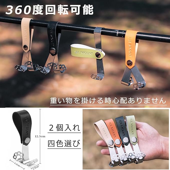 【サイズ情報】12.5*4.5*2.5cm。重量:22g(一個)。素材:ステンレス+革。セット内容:ハンギングラックフックx2。