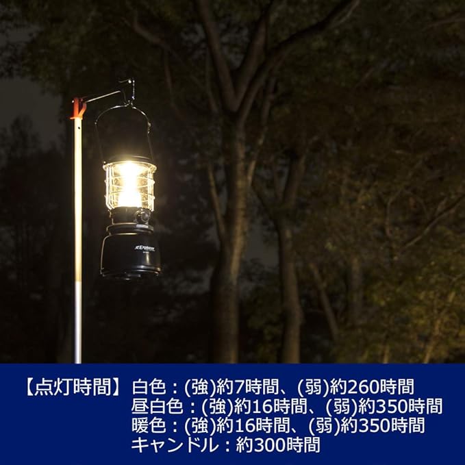 実用点灯:白色(強/7時間、弱/260時間)、昼白色(強/16時間、弱/350時間)、暖色(強/16時間、弱/350時間)、キャンドル/300時間