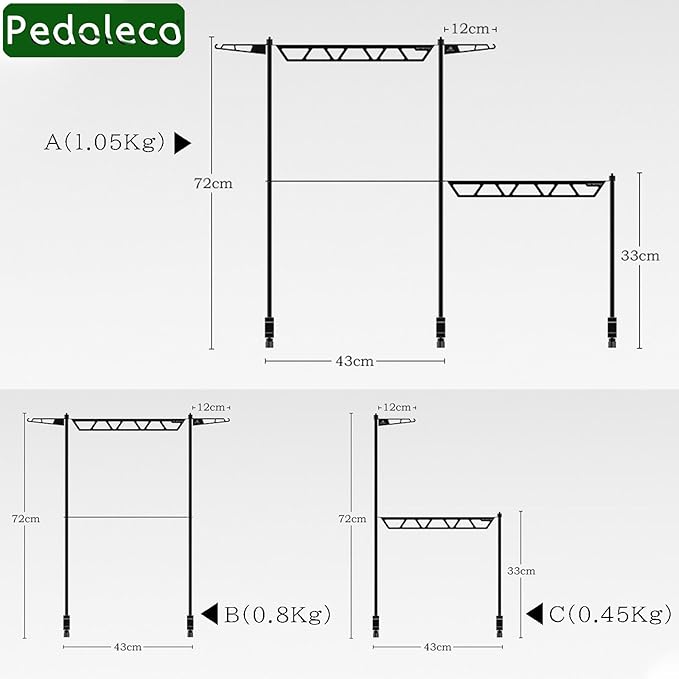 「商品詳細」材質:鉄&アルミ合金、収納サイズ:45*12*4cm、重量:A(1.05Kg)、B(0.8Kg)、C(0.45Kg)。