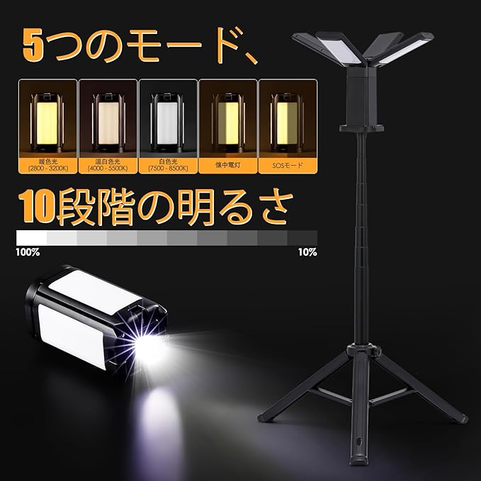 伸縮式三脚スタンドと携帯性の高いデザイン:伸縮式の三脚スタンドは頑丈なアルミ製で、50cmから190cmまで伸縮可能。異なる高さに簡単に対応でき、安定した支持力を発揮します。コンパクトに折りたためるので持ち運びや収納が簡単で、取り外し可能なランプヘッドと吊り下げフックを備えているため、様々な照明ニーズに対応できます。