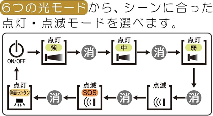6つの光モードから点灯・点滅モード選択可能なLED懐中電灯