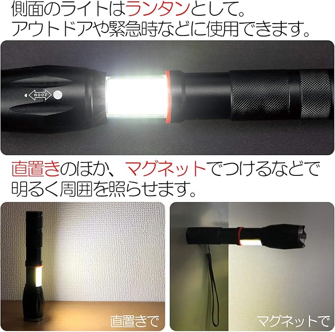 先端ライトは強・中・弱にきり替えられ、更に、本体を伸縮することでスポット・ワイドに調整可能なため、様々な用途に対応できる多機能懐中電灯です