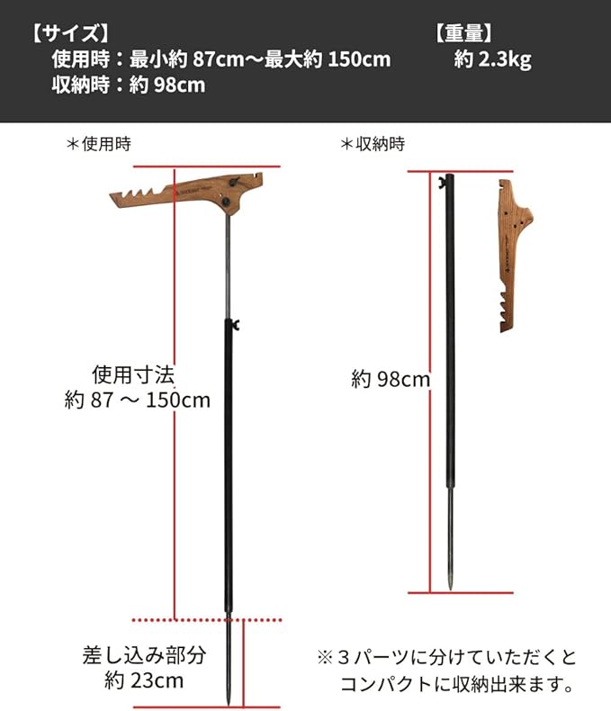 【ランタンスタンド SHOTGUN】■サイズ:[使用時]最小約87cm - 最大約150cm [収納時]約98cm ■重量:[本体]約2.3kg [ハンガー]約0.25kg ■材質:[本体]黒皮鉄 [ハンガー]天然木(無垢材)