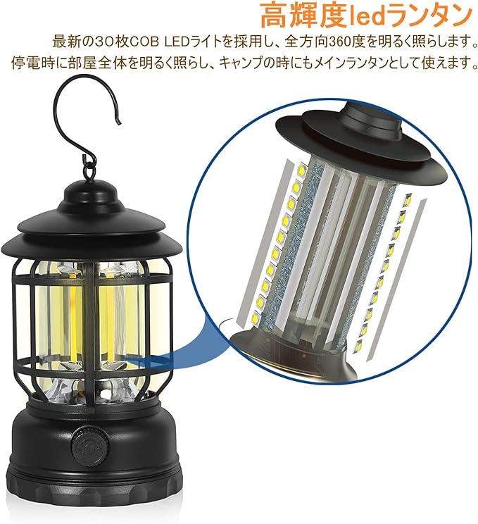 「 高輝度ledランタン 」 最新の30枚COB LEDライトを採用し、全方向360度を明るく照らします、明るさは10〜200ルーメンです。停電時に部屋全体を明るく照らし、キャンプの時にもメインランタンとして使えます。